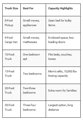 Again, there is a “perfect” truck rental size for your move. Let us give you a recap!