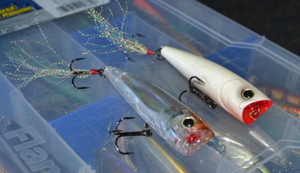Topwater – I prefer a popper which looks like an injured baitfish and it is an easy target for a hungry bass. This presentation will draw bass up to the surface, but it really excels when you see bass pushing shad and busting them on the surface. This is one of the most exciting strikes to watch.